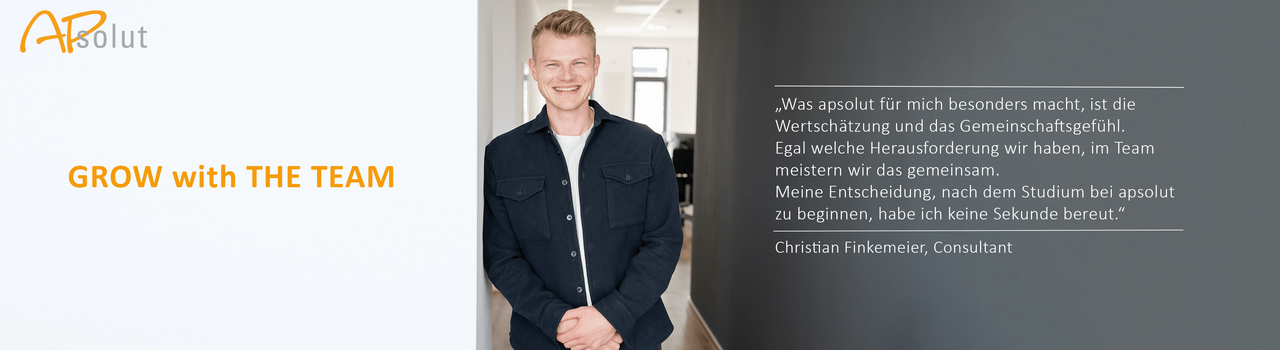 - Optimale Entwicklungsmöglichkeiten: Wir machen Karriereplanung für und mit unseren Mitarbeiter*innen! Unsere apsolut Academy sorgt zudem für Wissensaustausch und eine professionelle Weiterbildung.