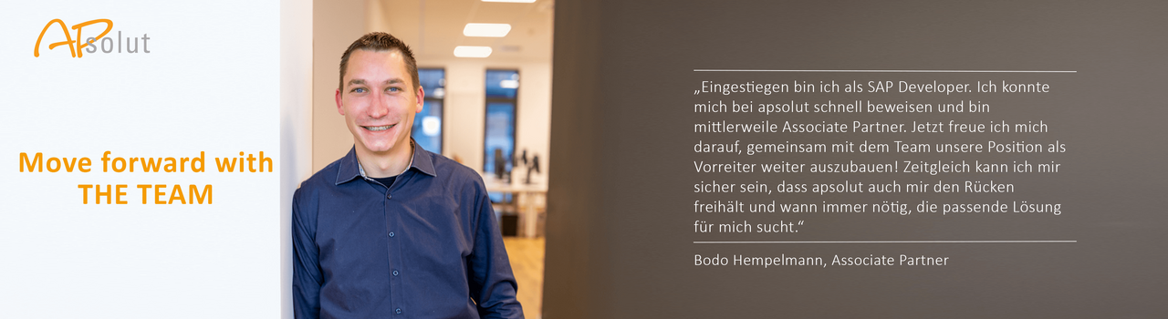 - Optimale Entwicklungsmöglichkeiten: Wir machen Karriereplanung für und mit unseren Mitarbeiter*innen! Unsere apsolut Academy sorgt zudem für Wissensaustausch und eine professionelle Weiterbildung.